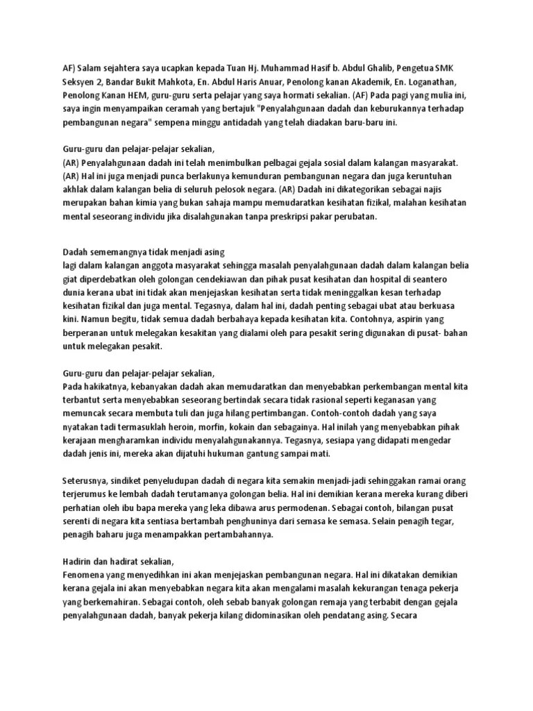 100 Karangan Contoh Pmr Dan Spm By Zaiton Zaba Issuu from image.isu.pub Penyalahgunaan dadah adalah isu yang rumit dan telah menjadi masalah kesihatan awam yang serius di malaysia terutama pada golongan remaja. Sebagai perbandingan, di malaysia jika kedapatan pengedar atau pecandu membawa dadah 5 gr ke atas maka orang tersebut akan dihukum mati. Tubuh badan yang siaht menjadi lemah. Penyalahgunaan dadah akan menyebabkan beberapa kesan kepada penagih. Penyalahgunaan dadah merupakan penggunaan dadah yang bertentangan dengan kepentingan rawatannya. Satu kajian kes pengajaran penyalahgunaan dadah dalam kalangan pelajar 1 tingkatan empat mohd noorazam abd razak2, fatin aliana mohd radzi3, mohamad azmi adnan4. Artikel ini merupakan sambungan daripada : Kesan penyalahgunaan dadah terhadap kesihatan disediakan :