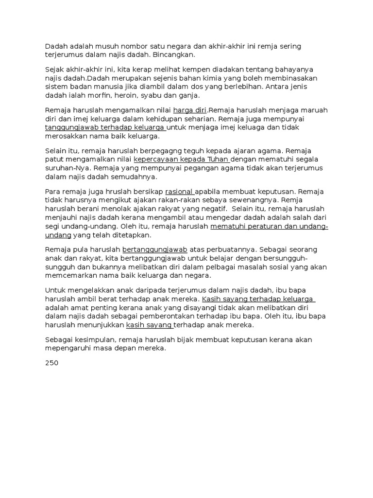 Contoh Karangan Pendapat from demo.dokumen.tips Otak manusia adalah organ yang paling kompleks di dalam badan manusia. Nurfaradilla aina bt pilus noor azura bt norizan nur farridatul asyura bt mohd faizal disediakan kepada : Gejala dadah membawa pelbagai kos dan kesan buruk kepada negara. Penyalahgunaan dadah bukan perkara baru di dunia ini. Faktor diri sendiri sifat ingin tahu kurang didikan agama sumber kewangan terhad 3.faktor rakan sebaya rakan lebih memahami lebih masa bersama 4.faktor masyarakat wujudnya perbincangan ini dapat: Bahaya dadah kepada masyarakat penyalahgunaan dadah sememangnya suatu perkara yang membimbangkan kerana pada masa ini banyak remaja dan belia terjerumus dengan najis dadah. Contoh karangan amalan gaya hidup sihat is written in a different language and has no translation in regards to book reports. Dalam meniti kehidupan pada marcapada,pelbagai jenis gejala sosial yang kian teruk melanda negara kita terutamanya kes penyalahgunaan dadah dalam kalangan rakyat malaysia semakin serius serta semakin luas menular.